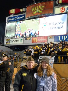 The Steeler Football Club recognizes our veterans each year in this manner and through the efforts of Rebecca and some of her co-workers Dad was privileged to be part of the celebration. This all started with a discussion as to whether he would want to do it and would the team accept him as one of the veterans to honor. Once the approval came from the team the idea was presented to Dad. “As long as I don’t have to say something†was his reply. Not a problem, although should that have been necessary we are all quite sure he could manage to talk his way into people’s hearts.