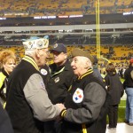 The big day was approached with a great deal of excitement, and a little planning. Dad was furnished with a great looking winter weight Steeler jacket complete with a World War II patch indicating his veteran status. Family members going to the game joined in dinner prior to heading to the stadium. Once there, Dad and a few of his guests went to a VIP tent where they were joined by the other veterans to prepare for the pregame ceremony.  Those veterans represented the other conflicts of the past 50 years including the Korean War, Vietnam, Desert Storm, Iraq and Afganistan. Among those there to greet and thank the vets was Steeler president Art Rooney II.