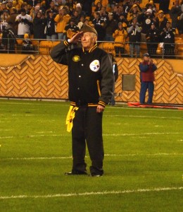 Everyone was escorted to the field and the sidelines behind the Steeler bench. In addition to Dad another gentleman represented WWII. He was at Pearl Harbor on December 7 so with him and Dad present, both the Pacific and European theaters were accounted for. When these two members of the greatest generation first saw each other they approached and without a word shook hands and hugged. They both knew what it means to have lived all of these years with the memories of war never far from the surface. Â