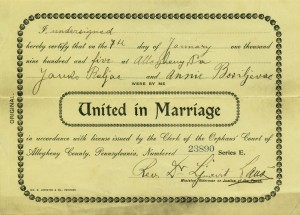 I finally was able to get someone who could translate the baptismal certificates of John and Anna. Anna’s fathers name is Janko Bosiljevac and her mothers name is Ana Tomashic. She was baptized, and probably born, in Ribnik, Karlovac, Zagreb, Croatia. At the time of her birth they lived at Griche, home #3, whatever that means. They were Romano-Catolics, at least that’s how the person translated it. She was baptized and born on the same day, July 17, 1881. Her parents were farmers.
